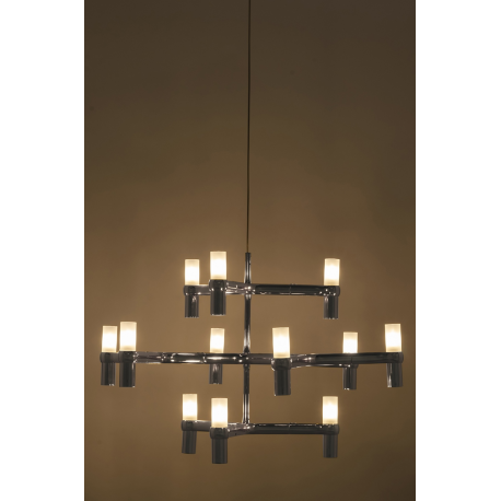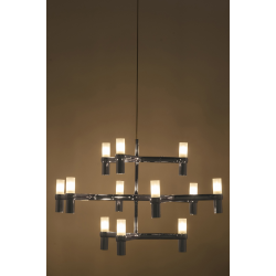 Lampa Atomic została wykonana z chromowanego metalu. Dzięki satynowym kloszom, lampa oferuje ciepłe i rozproszone światło. Lampa jest mniejszą wersją lampy Atomic Grande wyposażoej w 30 kloszy. Świa