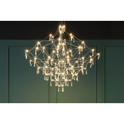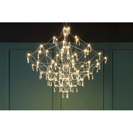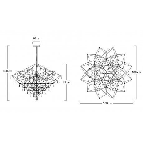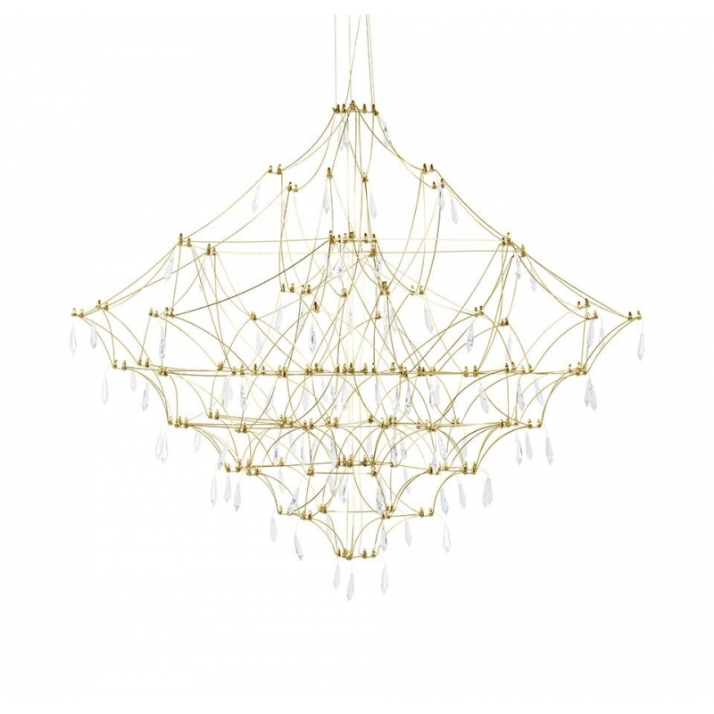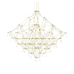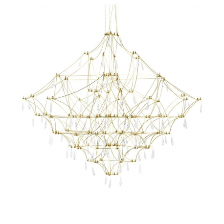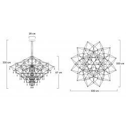 Lampa Constelation 100 Gold.Konstrukcja lampy wykonana została ze stali szczotkowanej w kolorze złotym.Metalowa pajęczyna, połączona z ledowymi źródłami światła tworzy wyjątkowo elegancką konstrukcję.Całość została wykończona dekoracyjnymi kryształkami.Światło: moduł LED 72 x 0,5 W / 2880 lm / 3000 KOprawa: szer. 260 cm / wys. 100 cm / gł. 100 cmKlosz: wys. 67 cm / szer. 100 cmMocowanie: szer. 20 cmMontaż: instalacja sufitowa Waga netto: 18 kgWymiary opakowania: 105 cm / 105 cm / 45 cmSposób wysyłki: paczka gabarytowa.