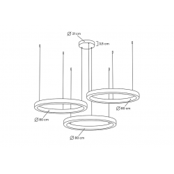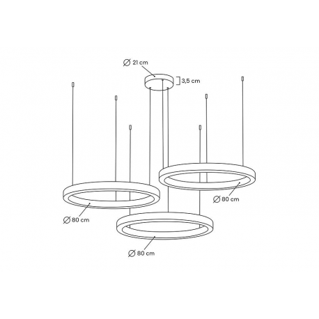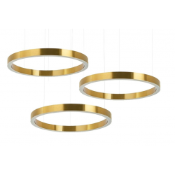 Lampa wisząca RING 80+80+80 złota.Połączenie nowoczesnych, eleganckich i bestselerowych opraw w dowolnych konfiguracjach na jednej podsufitce.Lampy Ring wykonano ze stali nierdzewnej w kolorze złotym i akrylowych osłon źródła światła.Kaskadowo zawieszone na metalowych linkach zapewnią optymalne oświetlenie oraz niezwykłe wrażenie wizualne.Światło: 3 x LED 50 W / 4000 lm / 3000 K (możliwość odpłatnej zmiany barwy światła na 4000 K)Oprawa: wys. 200 cm / szer. 160 cm / gł. 160 cmKlosz: 3 x wys. 5,7 cm / 3 x śr. 80 cmMontatura: wys. 3,5 cm / śr. 21 cmMontaż: instalacja sufitowa.