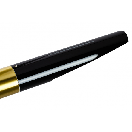 Lampa wisząca Apollo 1 czarna. Klasyczne połączenie czerni i szczotkowanego złota. Czarny, cylindryczny klosz został umieszczony na sztywnej konstrukcji w kolorze złotym. Charakter całej konstrukcji