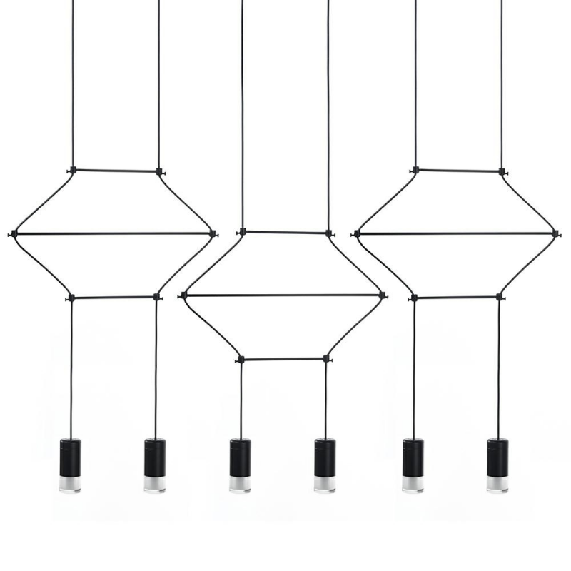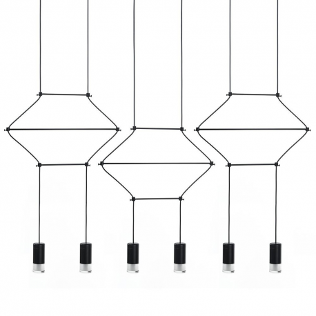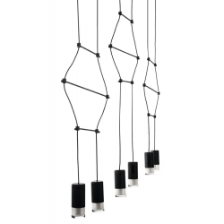 Lampa wisząca Flusso Line 6. Minimalistyczna i zaskakująca konstrukcja. Lampa wykonana została z sześciu jednakowych przewodów. Kształt lampie nadają metalowe elementy, które wraz z przewodami tworz