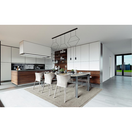 Lampa wisząca Flusso Line 6.Minimalistyczna i zaskakująca konstrukcja. Lampa wykonana została z sześciu jednakowych przewodów. Kształt lampie nadają metalowe elementy, które wraz z przewodami tworzą geometryczną konstrukcję w czarnym kolorze. Elementy pozwalają na połączenie dwóch przewodów, tworząc trzy oddzielne konstrukcje.Pozwala to na dowolną aranżację lampy. Przewody zakończone są sześcioma satynowymi kloszami.Całość tworzy wyjątkowo ciekawą lampę do niebanalnych wnętrz. Lampy z kolekcji Flusso dostępne są w wielu wariantach.Światło: 6 x G9 max. 5 W Oprawa: wys. 220 cm / szer. 100 cm / gł. 8 cmMocowanie: wys. 4 cm / szer. 86 cm / gl. 5 cm Montaż: instalacja sufitowaWaga netto: 4 kgWymiary opakowania: 93 cm / 15 cm / 15 cm.