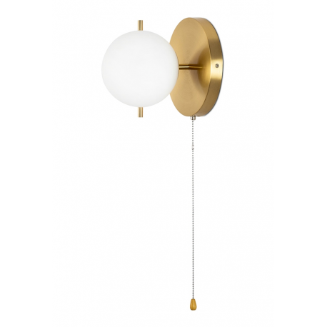 Lampa ścienna ORO złota.Nowoczesna oprawa wykonana z metalu w odcieniu mosiądzu oraz szklanego, mlecznego klosza.Oro jest niezwykle praktyczna poprzez zastosowanie dekoracyjnego włącznika, którym możemy oświetlić pomieszczenie w dogodnym dla nas momencie.Połączenie kolorystyczne tworzy przytulny klimat, dzięki czemu lampa świetnie sprawdzi się w salonie, czy w sypialni.Światło: E14 max. 40 W (brak w zestawie)Oprawa: wys. 59 cm / szer. 20 cm / gł. 21 cmKlosz szklany: śr. 15 cmŁańcuszek: dł. 40 cmMocowanie: śr. 20 cm / gł. 2,5 cm.