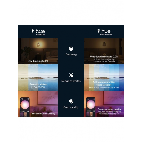 Ponad 50 000 dostępnych odcieni światła białego, od ciepłego po chłodne, pozwala uzyskać właściwy nastrój do pracy, zabawy lub relaksu, niezależnie od pory dnia. Możesz rozpocząć dzień przy chłodnym, energetyzującym, jasnym świetle białym lub usiąść wieczorem przy złotych odcieniach.