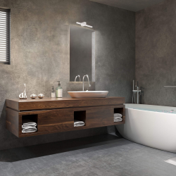 Lampa Nevada należy do lamp z kategorii kinkiety. Jest to lampa wyprodukowana z myślą o łazienkach, dlatego też zawiera niezbędny dla tego pomieszczenia wskaźnik IP44. Dzięki takiemu wskaźnikowi, produkt oświetleniowy jest w pewnym stopniu odporny przed kurzem i wodą. Wizualnie kinkiet NEVADA jest bardzo prosty w budowie, ponieważ ta oprawa oświetleniowa to tylko podstawa i podłużny, prostokątny “klosz”, który zawiera źródło światła LED. Lampa idealnie sprawdzi się w czarno-białych łazienkach, czyli w stylu Black & White, ponieważ posiada kolor czarny. Lampa Nevada świetnie będzie się prezentować w minimalnie urządzonych łazienkach. Nowoczesne wnętrza będą idealnym tłem dla tego kinkietu, który swym minimalistycznym wyglądem, nie zaburzy stylizacji całego wnętrza łazienki. Lampa występuje również w kolorze białym. Chcąc uzyskać większy efekt, można zamontować dwie takie same lampy w takich samych, bądź dwóch różnych kolorach, np. nad lustrami