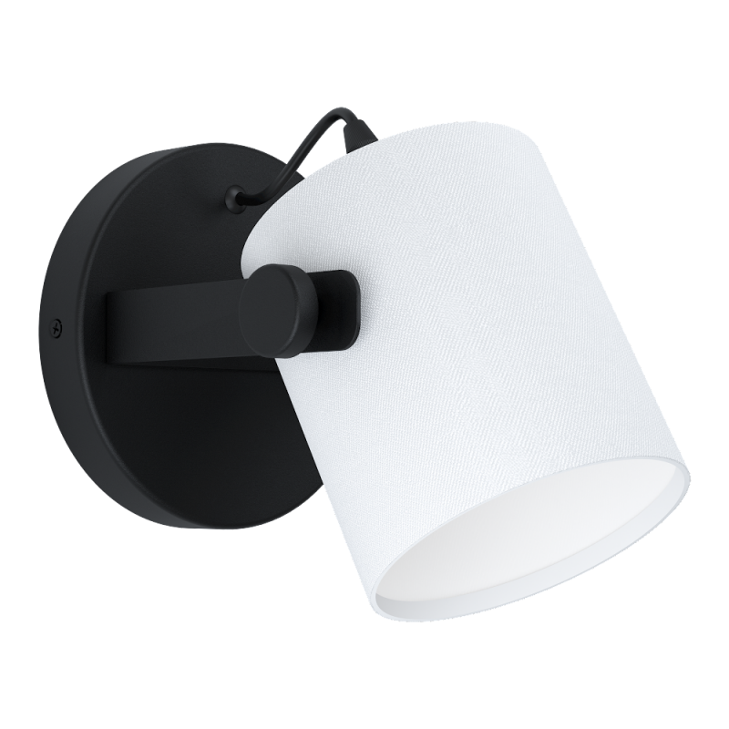 Lampa ścienna w stylu Vintage serii HORNWOOD 1. Biały, tekstylny abażur przymocowany jest do czarnej, metalowej podstawy.