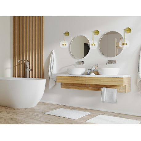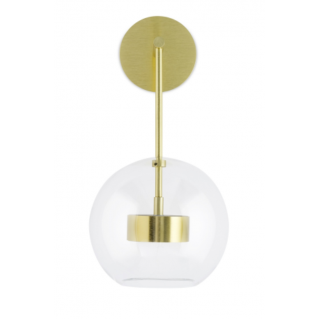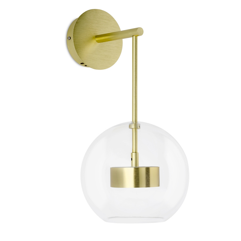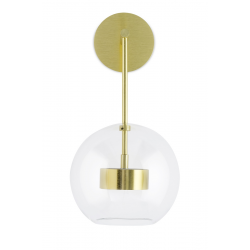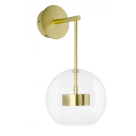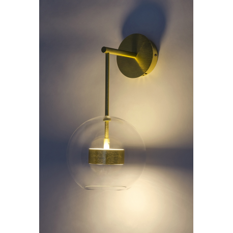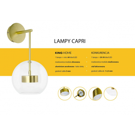 Kinkiet Capri Wall składa się z kulistego, szklanego klosza oraz anodowanego aluminium.Klosz umieszczony jest na aluminiowym ramieniu w złotym kolorze.Wewnątrz kuli znajduje się źródło światła LED.S