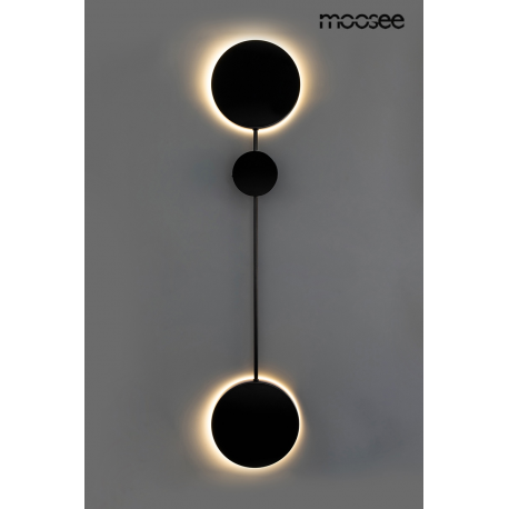 MOOSEE lampa ścienna SHADOW 2 czarnaNowoczesny kinkiet wykonany z metalu i aluminium w czarnym kolorze.Shadow można zawiesić również na suficie w formie plafonu.Okrągłe klosze skrywają źródło światła, dzięki czemu strumień świetlny odbija się od ściany.Oprawa tworzy efekt padającego cienia, co jednocześnie w przyjemny sposób oświetla pomieszczenie.Światło: LED 24 W / 1920 lm / 3000 KWymiary: wys. 95 cm / szer. 20 cm / gł. 4 cmKlosz: 2 x śr. 20 cm / gł. 3 cmMocowanie śr. 8 cm / gł. 4 cmMontaż: instalacja ściennaWaga netto: 1,8 kgWymiary opakowania: 105 cm / 27 cm / 11 cm.