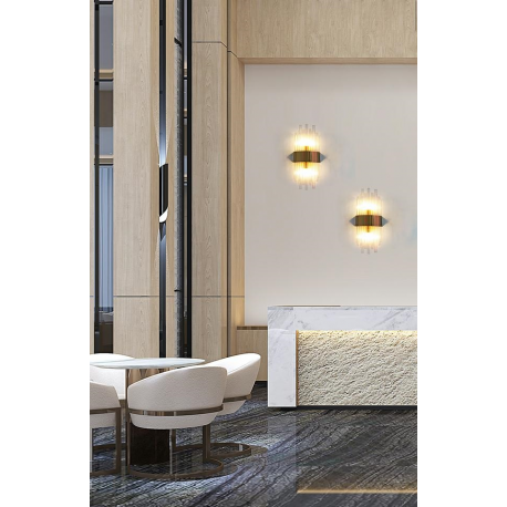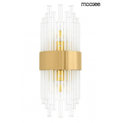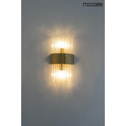 MOOSEE lampa ścienna PORTOFINO złota.Transparentne, szklane klosze o nieregularnych długościach tworzą efektowny kształt kinkietu. Stalowy, błyszczący element w kolorze złotym, oddziela strumień światła i wpisuje lampę w styl glamour.Światło: 2 x E14 max 40 W (brak w zestawie)Oprawa: wys. 52,5 cm / szer. 20 cm / gł. 10,5 cmElement ozdobny: wys. 9 cm Mocowanie: wys.10 cm / szer. 21 cmMontaż: instalacja ściennaWaga netto: 3 kgWymiary opakowania: 65 cm / 30 cm / 15 cm.
