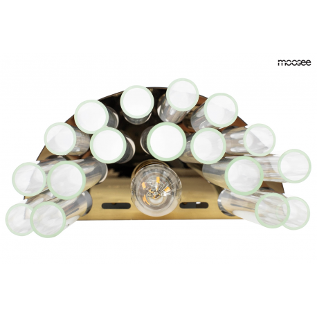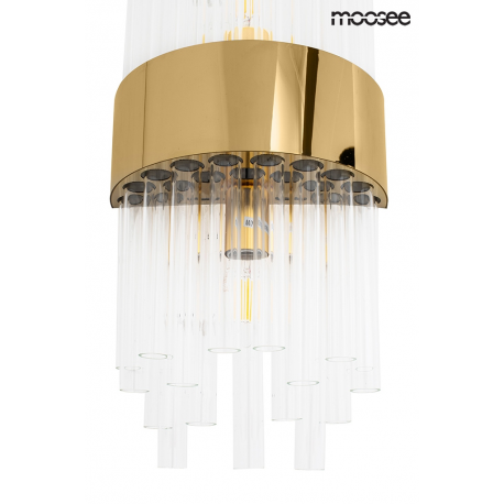 MOOSEE lampa ścienna PORTOFINO złota. Transparentne, szklane klosze o nieregularnych długościach tworzą efektowny kształt kinkietu. Stalowy, błyszczący element w kolorze złotym, oddziela strumień św