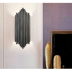 MOOSEE lampa ścienna HARMONIC BLACK.Kinkiet został wykonany w całości ze stali nierdzewnej w kolorze czarnym. Klosz z nieregularnie ułożonych elementów sprawia, że strumień światła zostaje rozproszony w przyjemny i ciekawy sposób.Światło: 2 x E14 max 40 W (brak w zestawie)Oprawa: wys. 50 cm / szer. 18 cm / gł. 10 cmMontaż: instalacja ściennaWaga netto: 3,2 kgWymiary opakowania: 57 cm / 25 cm / 17 cm.