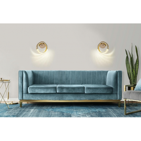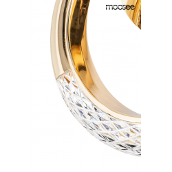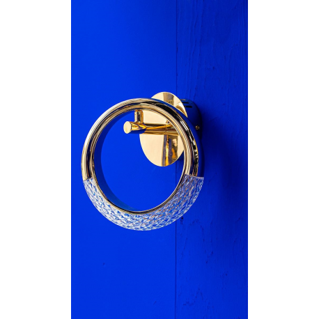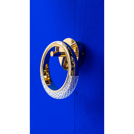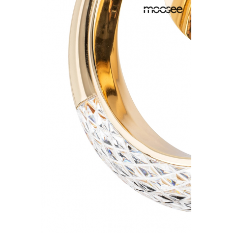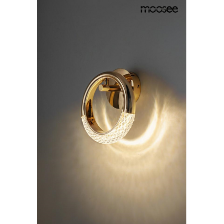 MOOSEE lampa ścienna HELIOS złota. Przypominająca elegancką kołatkę oprawa została wykonana z aluminium w złotym kolorze i dekoracyjnych kryształów. Błyszczący akcent klosza rozprasza padający strum