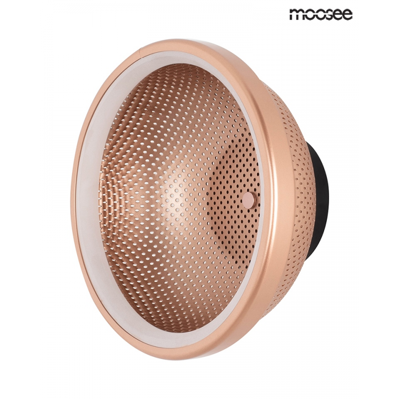 MOOSEE lampa ścienna FARO miedziana. Oprawa wykonana jest z połączenia akrylu i aluminium w miedzianym kolorze. Ciepłe światło rozświetla matowy klosz, a ażurowe wykończenie tworzy niesamowity efekt