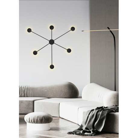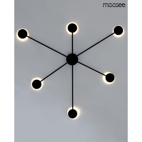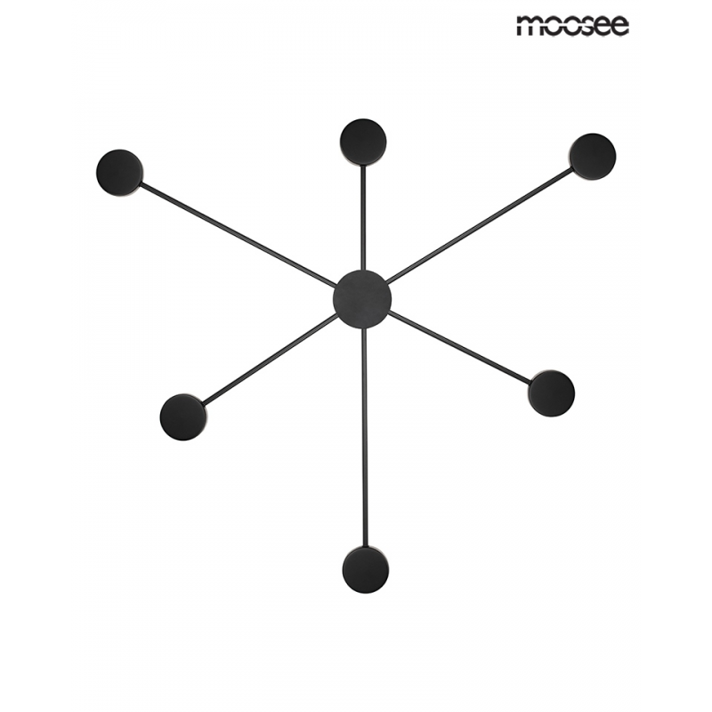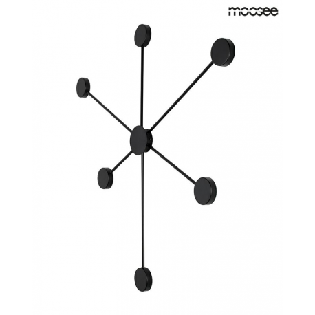 MOOSEE lampa ścienna SHADOW 6 CLOSE czarna.Nowoczesny kinkiet wykonany z metalu w czarnym, matowym kolorze. Shadow można zawiesić również na suficie w formie plafonu. Okrągłe klosze skrywają źródło światła, dzięki czemu strumień świetlny odbija się od ściany. Oprawa tworzy efekt padającego cienia, co jednocześnie w przyjemny sposób oświetla pomieszczenie.Światło: LED 26 W / 2080 lm / 3000 KOprawa: wys. 90,5 cm / szer. 88 cm / gł. 3,5 cmKlosz: śr. 8 cm / gł. 2,5 cmMocowanie: śr. 8 cm / gł. 3,5 cmMocowanie koło: śr. 10 cmMontaż: instalacja ściennaWaga netto: 1 kgWymiary opakowania: 93 cm / 93 cm / 10 cm.