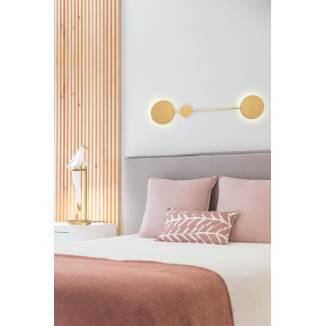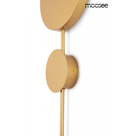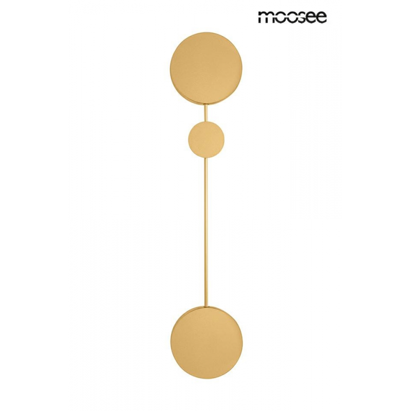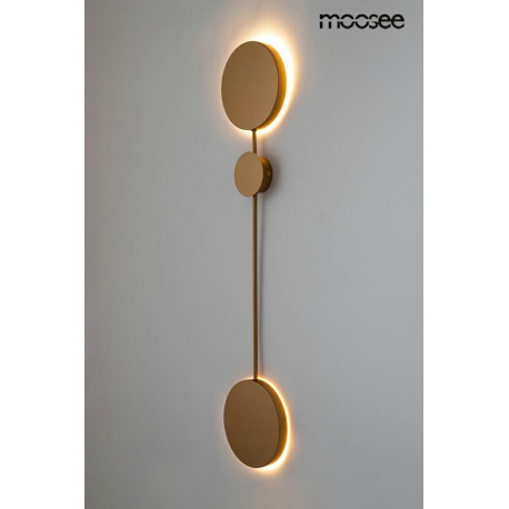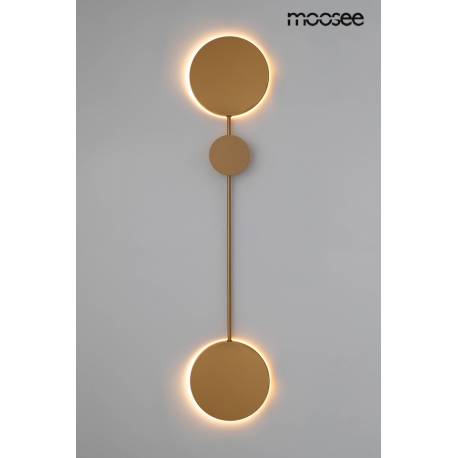 MOOSEE lampa ścienna SHADOW 2 złota.Nowoczesny kinkiet wykonany z metalu i aluminium w złotym kolorze.Shadow można zawiesić również na suficie w formie plafonu.Okrągłe klosze skrywają źródło światła, dzięki czemu strumień świetlny odbija się od ściany.Oprawa tworzy efekt padającego cienia, co jednocześnie w przyjemny sposób oświetla pomieszczenie.Światło: LED 24 W / 1920 lm / 3000 KWymiary: wys. 95 cm / szer. 20 cm / gł. 4 cmKlosz: 2 x śr. 20 cm / gł. 3 cmMocowanie śr. 8 cm / gł. 4 cmMontaż: instalacja ściennaWaga netto: 1,8 kgWymiary opakowania: 105 cm / 27 cm / 11 cm.