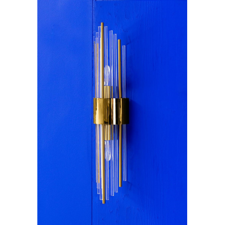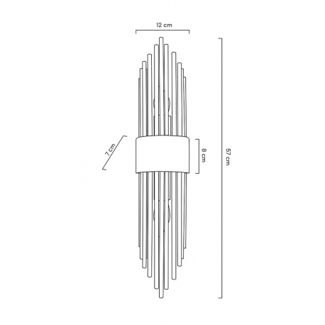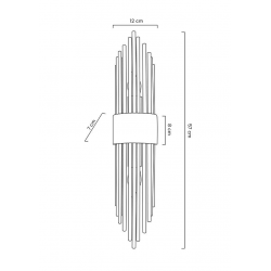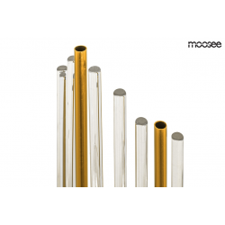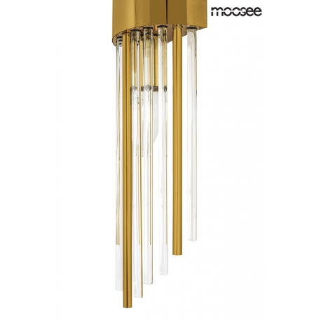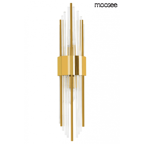 MOOSEE lampa ścienna AMANDA złota.Nowoczesna oprawa ścienna wykonana z połączenia szklanych kloszy i stali. Oświetlenie skierowane jest zarówno w górę, jak i w dół. Snop światła przebija się przez transparentne klosze, a zatrzymuje na złoto-pomarańczowych rurkach, co tworzy niezwykły efekt wizualny.Światło: 2 x E14 max. 40 W (brak w zestawie)Oprawa: wys. 57 cm / szer. 12 cm / gł. 7 cmMocowanie: wys. 8 cm / szer 12 cmMontaż: instalacja ściennaWaga netto: 1 kgWymiary opakowania: 64 cm / 17 cm / 11 cm.