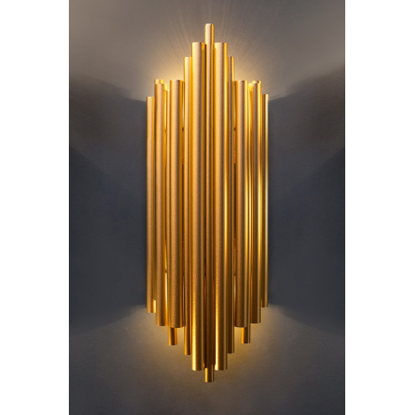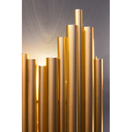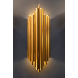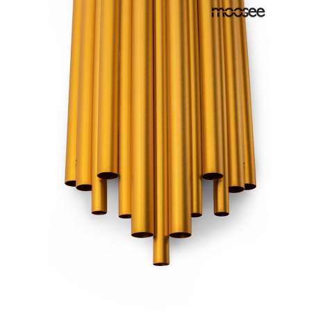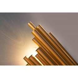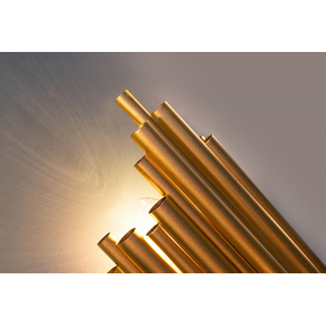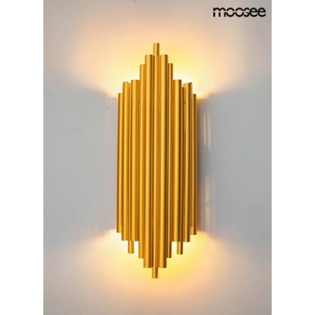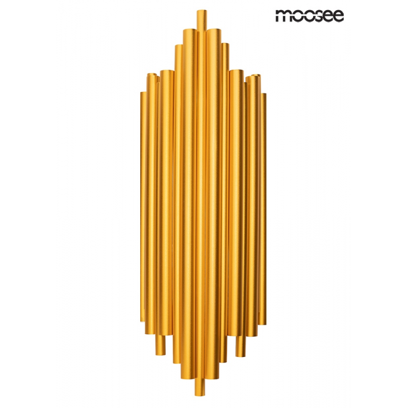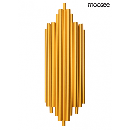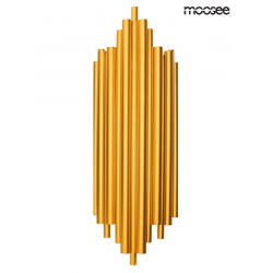 MOOSEE lampa ścienna HARMONIC złota. Kinkiet został wykonany w całości ze stali nierdzewnej w kolorze złotym. Klosz z nieregularnie ułożonych elementów sprawia, że strumień światła zostaje rozproszo