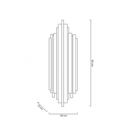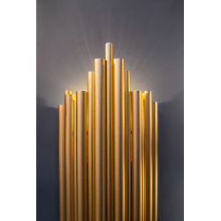 MOOSEE lampa ścienna HARMONIC złota.Kinkiet został wykonany w całości ze stali nierdzewnej w kolorze złotym.Klosz z nieregularnie ułożonych elementów sprawia, że strumień światła zostaje rozproszony w ciekawy sposób.Światło: 2 x E14 max. 40 W (brak w zestawie)Oprawa: wys. 50 cm / szer. 20 cm / gł. 12 cmMocowanie: wys. 10,5 cm / śr. 13,5 cmMontaż: instalacja ściennaWaga netto: 3,2 kgWymiary opakowania: 57 cm / 25 cm / 17 cm.