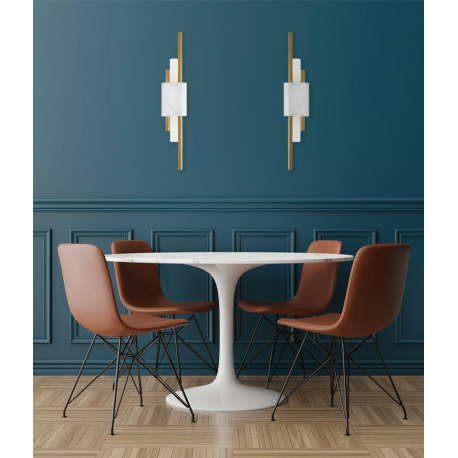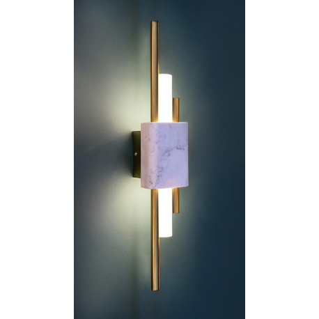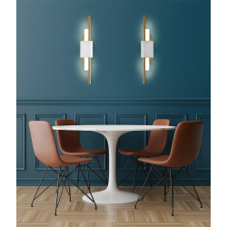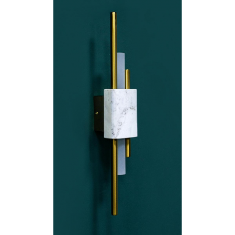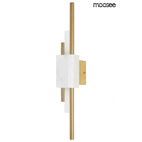 MOOSEE lampa ścienna EVANS biała / złota.Kompozycja łącząca klasyczny design z nowoczesnością. Złote, podłużne elementy optycznie wydłużają kinkiet.Klosze wykonane z mrożonego szkła skrywają moduły LED o ciepłej barwie, a snop światła skierowany jest do dołu, jak i do góry.Całość spina klamra wykonana z naturalnego marmuru, dzięki czemu każdy egzemplarz jest unikatowy.Evans z powodzeniem ozdobi wnętrze domu, restauracji oraz hotelowego lobby.Światło: LED 5 W / 400 lm / 3000 KOprawa: wys. 51,5 cm / szer. 9,5 cm / gł. 9,5 cm Mocowanie: wys. 9 cm / szer. 6 cm / gł. 5,5 cm Montaż: instalacja ścienna Waga netto: 1,5 kg Wymiary opakowania: 55 cm / 15 cm / 15 cm.