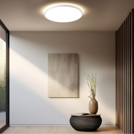 Źródło światła: Lampa posiada dwa wbudowane światła LED. Główne światło LED CCT oraz tylne światło LED o ciepłej barwie 3000K. Dodatkowo plfon ma możliwość wyboru preferowanej mocy światła.
