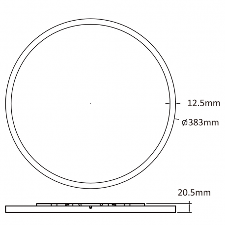 Wymiary: Plafon posiada średnicę równą 38 cm, wysokość równą 2 cm. Uwaga! Plafon po montażu nie przylega bezpośrednio do sufitu. Niewielka przestrzeń pomiędzy lampą, a sufitem zapewnia optymalne rozproszenie światła tylnego.