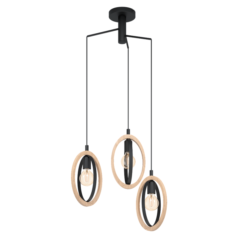 Lampa wiszaca BASILDON wykonana z naturalnego drewna i czarnej stali w kształcie ringów
