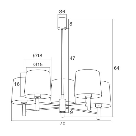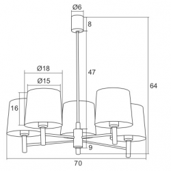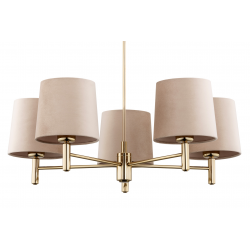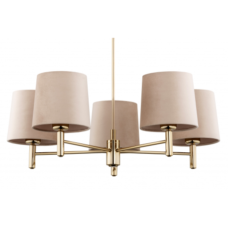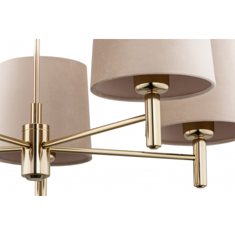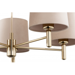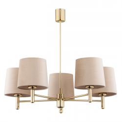 Duży elegancki żyrandol Ponte Plus. To lampa z klasą, żyrandol podkreślający styl pomieszczenia, idealny do wnętrz glamour, tam gdzie liczy się gustowny wystrój. Lampa ma tkaninowy abażur oraz efektowny, świetnie skonstruowany stelaż z solidnej stali pokrytej mosiądzem (kolor złoty). Produkt został w całości wyprodukowany w Polsce przez firmę Argon.
