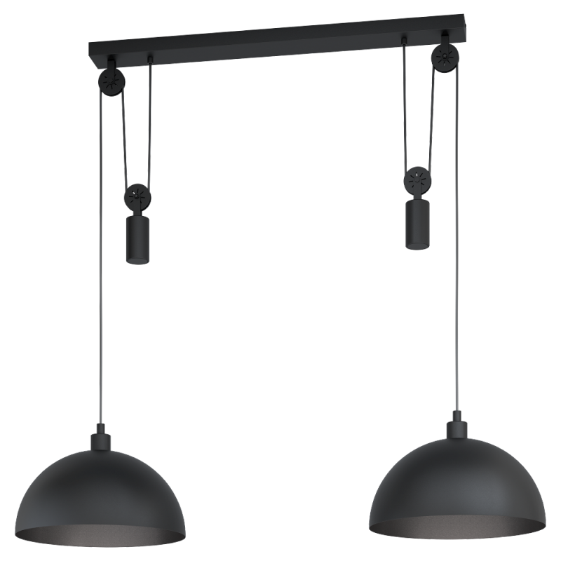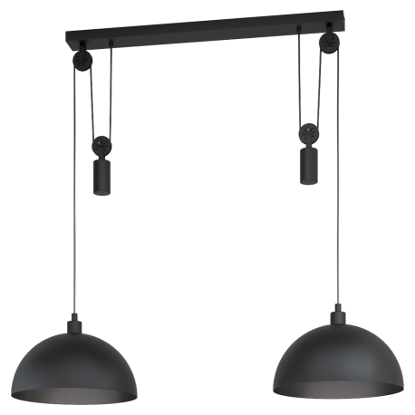 Lampa wisząca WINKWORTH 1 z przeciwwagą. Głównym elementem lampy są dwa okrągłe, czarne, metalowe klosze, oraz przeciwwagi, dzięki którym wysokość lampy można dostosować do indywidualnych potrzeb