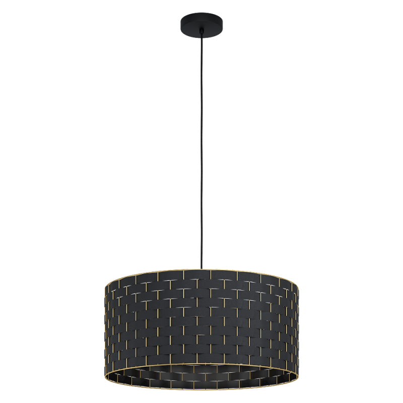 Pięknie wykonana lampa wisząca serii MARASALES o średnicy 55 cm. Czarna podsufitka oraz czarny, przeplatany abażur owinięty wokół złotego stelaża tworzą wyjątkowy efekt