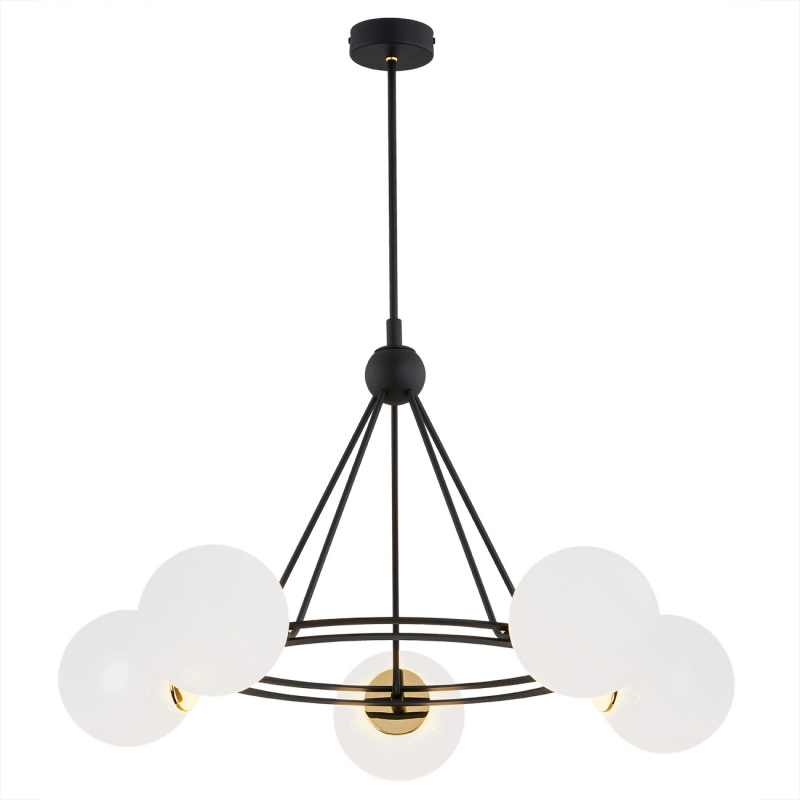 Nowoczesny żyrandol do salonu. Lampa wisząca do pokoju młodzieżowego. AMALFI to nowoczesna lampa ring w kolorze czarnym z białymi szklanymi kulkami.