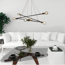 Estrella 6 wisząca czarna - to jedna z naszych nowości, stworzona dla tych, którzy lubują się w industrialnych i surowych klimatach. Przedstawiamy Państwu oświetlenie na czarnym, metalowym stelażu z prętami, o dość długim, lecz regulowanym przewodzie. Oświetlenie to posiada 6 źródeł światła. Ta niecodzienna, interesująca lampa, z całą pewnością wzbudzi podziw Twoich gości. Dzięki niej, uzyskacie Państwo, przepięknie rozprzestrzeniające się światło, nad stołem w jadalni czy w salonie. Jak wcześniej wspomnieliśmy, produkt idealnie wpasowuje się w industrialny styl, który w punkt pasowałby w ceglane otoczenie. Z drugiej jednak strony, taki model oświetlenia, oryginalnie by przełamywał luksusowy wystrój salonu. Lampa ta, zawiera także złote elementy, co dodatkowo podnosi jej efektywność.