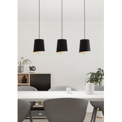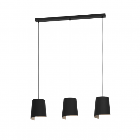 Lampa wisząca BOLIVIA składa się z trzech czarnych metalowych kloszy i piaskowego wnętrza. Specjalny kształt klosza nadaje lampie wyjątkowy wygląd. Klosze zawieszono na długim metalowym baldachimie w tym samym kolorze z czarnymi tekstylnymi kablami. Lampa wisząca oferuje stylowe oświetlenie w salonie lub w jadalni nad stołem jadalnym. Żarówki nie wchodzą w zakres dostawy. Lampa pasuje do każdej żarówki z trzonkiem E27
