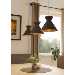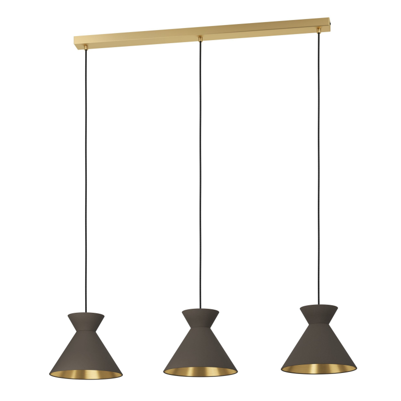 Lampa wisząca NASTASIA składa się z trzech metalowych kloszy w kształcie klepsydry w kolorze cappuccino i złotego wnętrza. Lampa została połączona z wydłużonym, mosiężnym, szczotkowanym metalowym zawieszeniem i czarnymi kablami tekstylnymi. Stylowa lampa wisząca jest idealnym uzupełnieniem nowoczesnych mebli i zapewnia przyjemne oświetlenie w Twoim pokoju - czy to w salonie, czy w jadalni nad stołem jadalnym. Żarówki nie wchodzą w zakres dostawy. Lampa nadaje się do każdej lampy z trzonkiem E27.