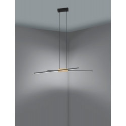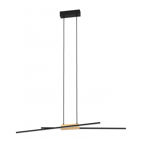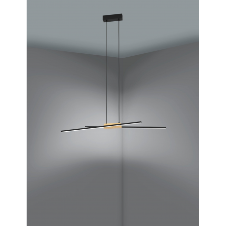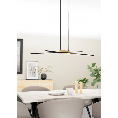 Lampa wisząca LED PANAGRIA jest wykonana z czarnego metalu i naturalnego drewna o wyglądzie dębu. Do niewielkiej drewnianej podstawy przymocowane są dwa czarne, smukłe profile LED. Zainstalowane na stałe diody LED zapewniają przyjemne, ciepłe, białe światło i można je ściemniać w 3 stopniach za pomocą odpowiedniego ściemniacza obrotowego na ścianie. Lampa wisząca wpisuje się w prawie każdy żyjący trend i przyciąga wzrok w salonie lub jadalni, na przykład nad wydłużonym stołem jadalnym.