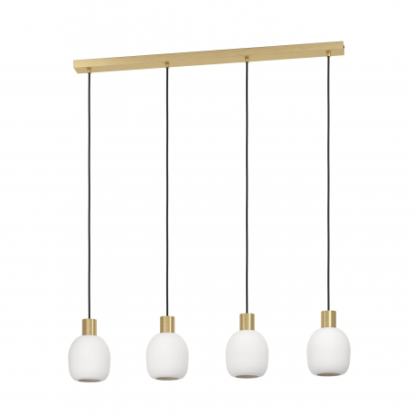 Lampa wisząca MANZANARES składa się z czterech delikatnie zaokrąglonych kloszy z białego szkła z opalizującą matową powierzchnią, które są zawieszone na wydłużonym metalowym daszku ze szczotkowanego mosiądzu z czarnymi kablami tekstylnymi. Połączenie kloszy z mosiężnymi, szczotkowanymi metalowymi dodatkami dopełnia wygląd lampy. Dzięki eleganckiemu wzornictwu lampa wisząca komponuje się z różnymi stylami wyposażenia i oferuje nowoczesne oświetlenie w salonie lub jadalni nad stołem jadalnym. Żarówki nie wchodzą w zakres dostawy. Lampa nadaje się do każdej lampy z trzonkiem E27.