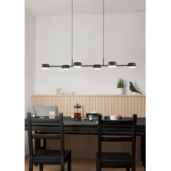 Lampa wisząca LED CLAVELLINA wykonana jest z czarnej metalowej podstawy, z której zawieszono metalowe ramię świetlne w tym samym kolorze, do którego przymocowano cztery inne krótkie ramiona świetlne. Na końcu każdego ramienia znajduje się sześć okrągłych, czarnych metalowych główek lamp, które dzięki wbudowanym diodom LED w białych akrylowych powierzchniach świetlnych zapewniają przyjemne, ciepłe światło. Dzięki uderzającemu wzornictwu lampa wisząca płynnie wtapia się w minimalistyczne meble i oferuje nowoczesne oświetlenie w Twojej przestrzeni życiowej.