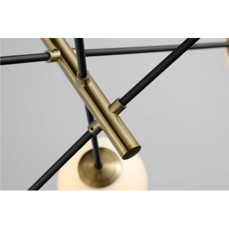 OVIEDO 8 to lampa zaliczana do kategorii opraw molekularnych, czyli takich, których wygląd przypomina budowę cząsteczki. Pod każdym z ośmiu szklanych, kulistych kloszy jest miejsce na pojedyncze źródło światła (również produkty LED). Kule są połączone między sobą prostymi ramionami, wykonanymi z metalu. W naszej ofercie lampa występuje w kolorze czarnym lub czarno-złotym.