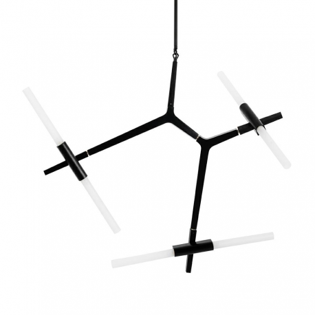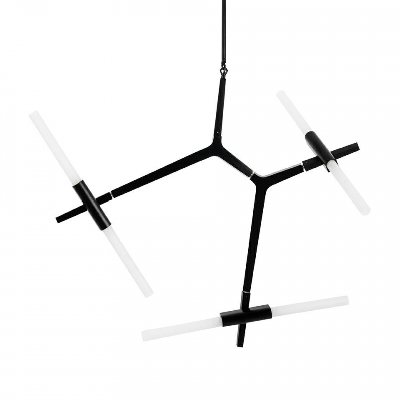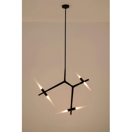 Lampa Candelabr 6 składa się z aluminiowych wygiętych ramion w kolorze czarnym. Ramiona są zakończone szklanymi, satynowymi kloszami. Całość jest inspirowana gałęzią drzewa. Lampa występuje w różnyc