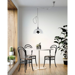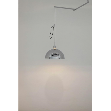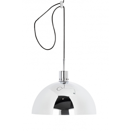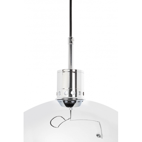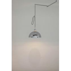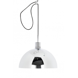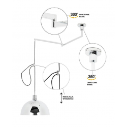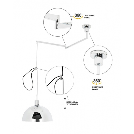 Lampa wisząca ROTA 360 srebrny chrom. Rota została wykonana w całości z chromowanego metalu. Łączy w sobie półokrągły klosz skrywający źródło światła oraz zmodyfikowany stelaż z możliwością wykonani