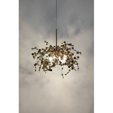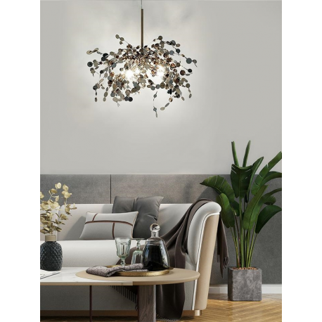 Lampa wisząca Monete chromowana.Wyjątkowo ciekawa lampa która przykuwa uwagę i pobudza kreatywność.Konstrukcja lampy wykonana została z chromowanego metalu.Klosz przypominający swoim wyglądem, garści monet podrzuconych do góry.Został zawieszony na transparentnym przewodzie i podsufitce w kolorze lampy.Lampy z kolekcji Monete będą świetnym dodatkiem nad stołem w jadalni lub ekstrawaganckim elementem salonu.Światło: 3 x G9 max. 40 W (brak w zestawie)Oprawa: wys. 200 cm / szer. 40 cm / gł. 40 cmKlosz: śr. 40 cmMocowanie: wys. 3,5 cm / śr. 10 cmMontaż: instalacja sufitowaWymiary opakowania: 32 cm / 32 cm / 25 cm.