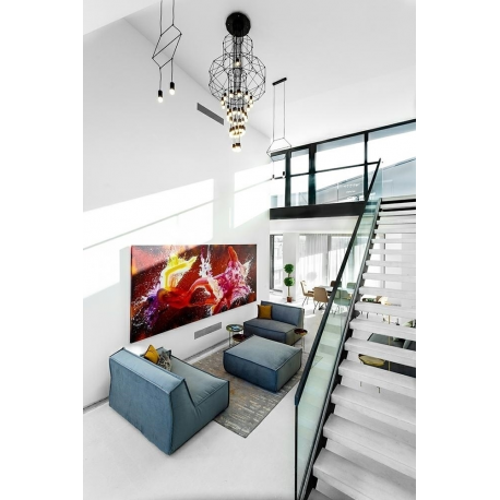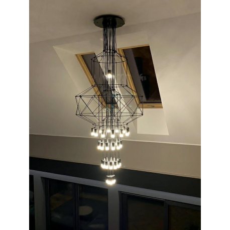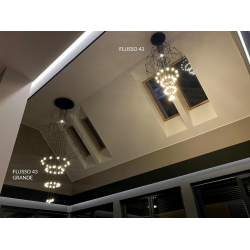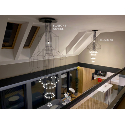 Lampa FLUSSO 43 w kolorze czarnym,została wykonana z przewodów osadzonych na stalowych prętach, które poprzez zagięcia nadają oprawie wyjątkowy kształt.Metalowe klosze skrywające źródło światła wykończone są szkłem satynowym.Geometria w połączeniu z prostą formą daje praktyczną, a także unikatową lampę, która znajdzie swe zastosowanie w wysokich wnętrzach w stylu loftowym oraz industrialnym.Światło: 43 x G9 max. 5WOprawa: wys. 220 cm / szer. 90 cm / gł. 90 cmMontaż: instalacja sufitowaWaga netto: 10 kgWymiary opakowania: 94 cm / 94 cm / 31 cmSposób wysyłki: paleta.