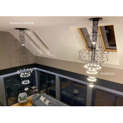 Lampa FLUSSO 43 w kolorze czarnym, została wykonana z przewodów osadzonych na stalowych prętach, które poprzez zagięcia nadają oprawie wyjątkowy kształt. Metalowe klosze skrywające źródło światła wy