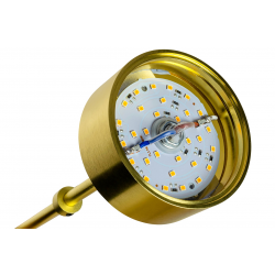 Wewnątrz każdej z kul jest złoty, szczotkowany pręt zakończony źródłem światła LED.