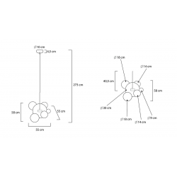 Lampa Capri 6 składa się z kulistych, szklanych kloszy oraz anodowanego aluminium.Główna kula zawieszona jest na delikatnym przewodzie.Wewnątrz kuli jest złoty, szczotkowany pręt zakończony źródłem