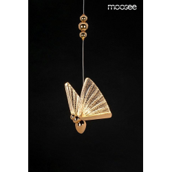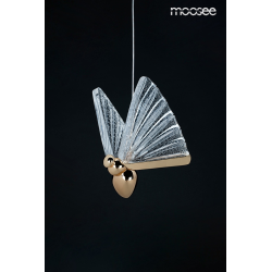 MOOSEE lampa wisząca BUTTERFLY S złota. Designerski motyw lampy wykonany z aluminium w kolorze złotym z transparentnymi, kryształowymi skrzydłami. Na regulowanej lince mocującej znajduje się element