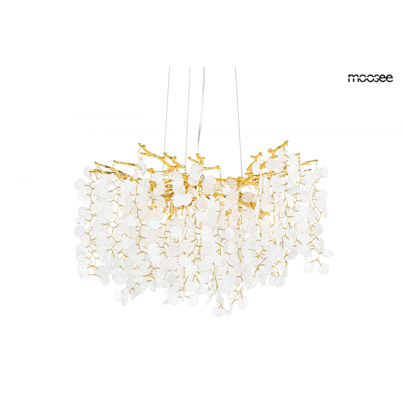MOOSEE lampa wisząca RIVIERA 60 złotaEkskluzywna i niecodzienna oprawa, która udekoruje Twoje wnętrze.Zbiór wykonanych z pełną precyzją akrylowych kloszy zamontowano na stalowej obręczy w kolorze złotym, imitującej gałęzie drzewa.Wśród kloszy ukryto aż 8 źródeł światła, które pięknie oświetlą przestrzeń i stworzą niesamowity efekt wizualny.Ciekawą funkcją jest też możliwość regulacji kąta nachylenia światła.Riviera to lampa o wielu zaletach, która doskonale sprawdzi się w salonie urody czy restauracji.Światło: 8 x G9 max. 20 WOprawa: wys. 152 cm / szer. 60 cm / gł. 60 cmKlosz: wys. 47 cm / szer. 60 cm / gł. 60 cmMocowanie: wys. 4 cm / śr. 15 cm Przewód: 115 cmMontaż: instalacja sufitowaWaga netto: 11 kgWymiary opakowania: 31 cm / 31 cm / 38 cm.