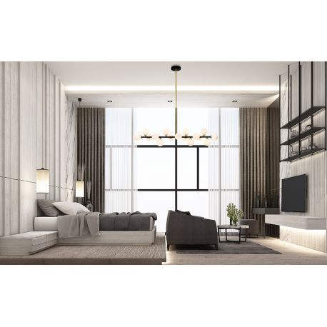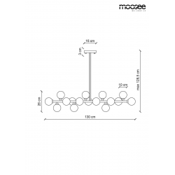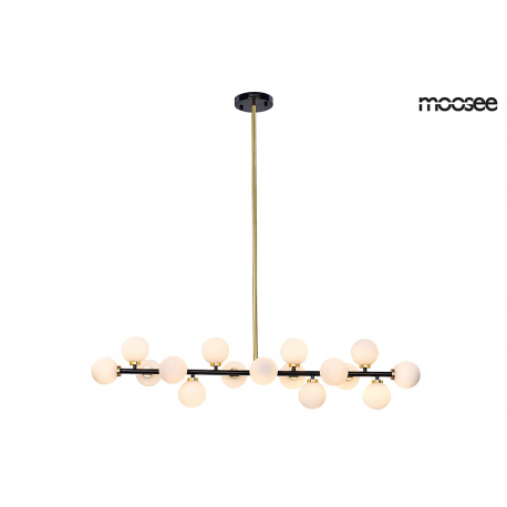 Lampa wisząca COSMO LEVEL M od marki MOOSEE.Lampy z kolekcji Cosmo wykonane zostały z połączenia metalu w czarnym, satynowym kolorze, złotych dekorów i szklanych kulistych kloszy. Szesnaście kloszy wykonanych z mlecznego szkła umieszczono na podłużnej konstrukcji. Całość została zawieszona na złotej podsufitce i złotym mocowaniu.Kolekcję Cosmo cechuje elegancja i doskonałe wykonanie. Lampa z powodzeniem rozświetli wnętrze salonu, kuchni lub hotelowego lobby. Światło: LED 16 x G4 max. 2,5 W (brak w zestawie)Oprawa: wys. 128,5 cm / szer. 130 cm / gł. 26 cm Klosz: szer. 130 cm / wys. 26 cmKlosz - kula: śr. 10 cmMocowanie: śr. 15 cm / wys. 3 cmMontaż: instalacja sufitowaWaga netto: 6 kgWymiary opakowania: 120 cm / 20 cm / 55 cmSposób wysyłki : Paleta.