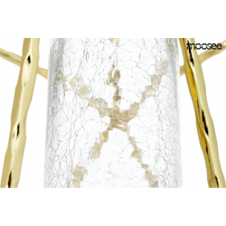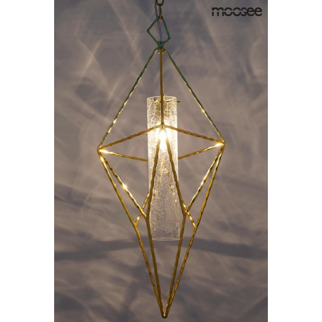 Lampa wisząca HAVANA L od marki MOOSEE. Geometryczną konstrukcję wykonano z połączenia metalu w kolorze złotym i szklanego klosza. Klosz otoczony jest geometrycznym stelażem. Całość została umieszcz