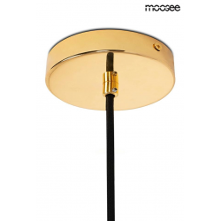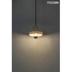 Lampa wisząca ARCO od marki MOOSEE. Okrągły klosz wykonany z jasnego marmuru tworzy wyjątkowo elegancką kompozycję. Arco została zawieszona na złotej podsufitce i czarnym przewodzie. Całość cechuje