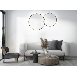 MOOSEE lampa wisząca CIRCULO 80 czarna.Minimalistyczna oprawa w kształcie okręgu została wykonana z metalu i aluminium w kolorze czarnym.Lekka konstrukcja z wbudowanym źródłem światła o ciepłej barwie, zwieszona na dwóch linkach stabilizujących lampę.Niezwykle proste, dekoracyjne oświetlenie sprawdzi się w zaciszu domowym, jak i w instytucjach publicznych.Światło: LED 43 W / 3440 W / 3000 KOprawa: wys. 250 cm / szer. 80 cm / gł. 15 cmKlosz LED: śr. 80 cm / gł. 2 cmPrzewód: 195 cmMocowanie: wys. 4,5 cm / śr. 15 cmMontaż: instalacja sufitowaWaga netto: 3,4 kgWymiary opakowania: 85 cm / 85 cm / 11 cm.